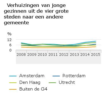 Dat constateerde het CBS in juni 2016. Vooral Amsterdam zag relatief veel jonge ouders vertrekken. Rotterdam, Utrecht en Den Haag zagen ook jonge gezinnen weggaan maar minder dan Amsterdam.