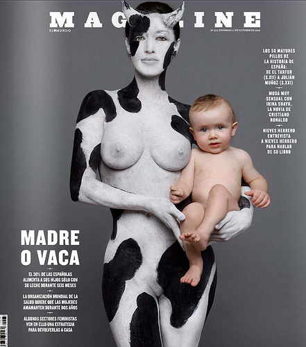 Het Spaanse tijdschrift El Mundo zorgde voor ophef met het artikel ‘Madre o vaca?’ Hevig gehinderd door mijn gebrek aan kennis van de Spaanse taal, maar een eind op weg geholpen door de foto, werd het mij duidelijk dat dit artikel níet pro-borstvoeding is.